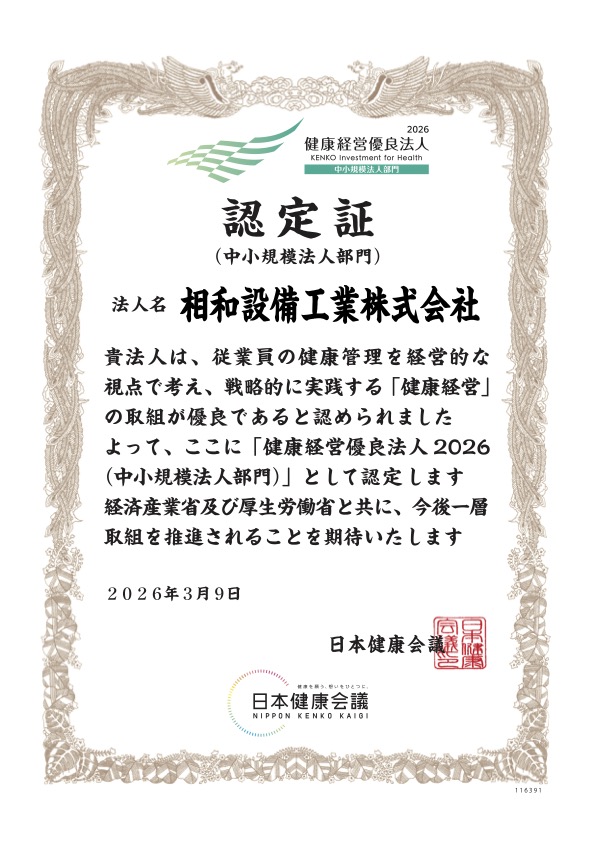 2026.3 健康経営優良法人認定 2026年も健康経営優良法人として認定を受けることができました。 現場で働く我々は、 インフラや住環境に携わるということで強い責任感を持って 日々の業務にあたっています。 それでも何より、どんなことがあっても、まずは体が資本。 夢中になって仕事をして、体を壊していた。 責任感から無理をして怪我をした。 そんなことがあっては、絶対にならないのです。 無理をしない、させないコミュニケーション。 健康管理をきちんとするシステム構築。 そんな環境を維持すべく、今後も努力を続けて参ります。